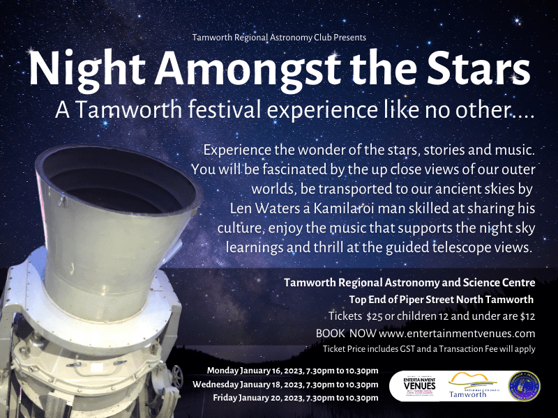It all takes place at the Tamworth Regional Astronomy and Science Centre where you will also enjoy interactive displays, the Roll off Roof Observatory and Planetarium Theatre. Situated in the Victoria Park Precinct at the top end of Piper Street in North Tamworth. There is parking close by or catch the Festival Express Route 431.