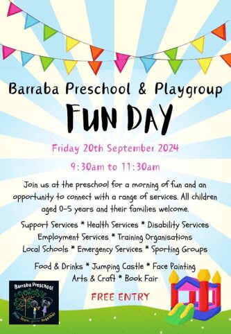 The Barraba Preschool & Playgroup Fun Day is happening on Friday, 20th September 2024 from 9:30 AM to 11:30 AM. This exciting event offers a fun-filled morning designed for children aged 0-5 years and their families. It’s a great opportunity to explore a wide range of services, including support services, health services, disability services, and employment and training organizations. Local schools, emergency services, and sporting groups will also be present to share information and connect with the community.