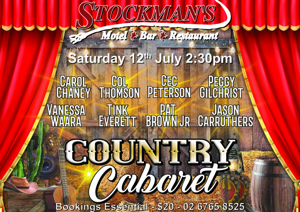As part of the Hats Off to Country Music Festival, enjoy an unforgettable afternoon of live country music at the Stockman’s Country Cabaret on Saturday 12 July from 2:30pm. Featuring performances by Carol Chaney, Col Thomson, Cec Peterson, Peggy Gilchrist, Vanessa Waara, Tink Everett, Pat Brown Jr, and Jason Carruthers, this line-up promises great tunes and plenty of toe-tapping fun. Tickets are just $20 and bookings are essential—call 02 6765 8525 to secure your spot for this fantastic Hats Off celebration!