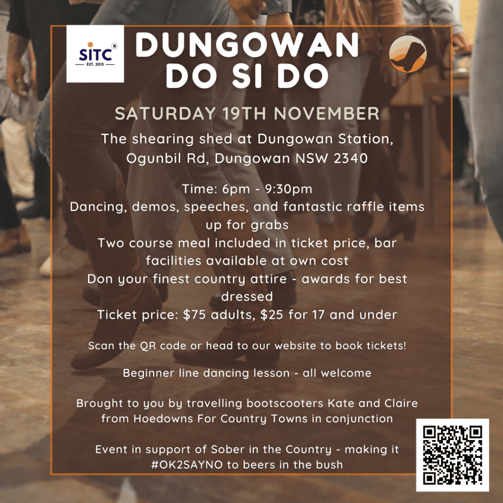 Dancing, demos, speeches, and fantastic raffle items up for grabs. Shanna Whan from Sober in the Country will be there on the night to tell her story and boogie the night away with us all.