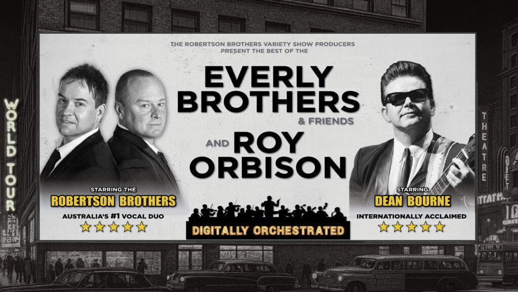 Australia’s #1 vocal duo, the much-loved Robertson Brothers, join forces with the internationally acclaimed Dean Bourne — the world’s greatest Roy Orbison tribute artist — and the Variety Show team for an unforgettable 2-hour audio-visual spectacular. This unique concert also showcases the hits by The Beatles, The Hollies and Simon & Garfunkel that were inspired and influenced by the Everly Brothers iconic songs and harmonies.