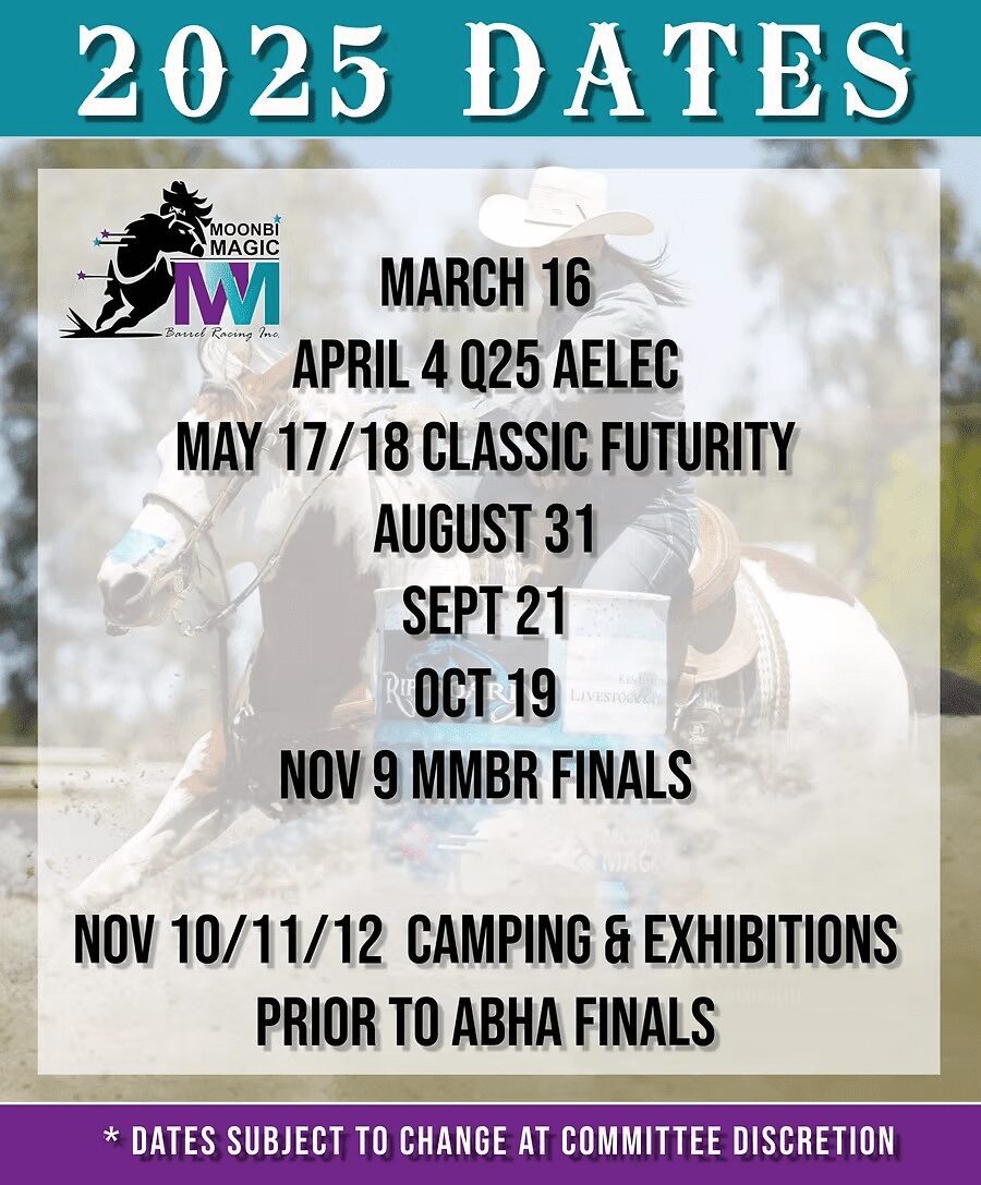 Join us for an exhilarating afternoon of barrel racing at the prestigious Australian Equine and Livestock Events Centre (AELEC) during the Australian Quarter Horse Association (AQHA) Q25 National Championship Show. Hosted by Moonbi Magic Barrel Racing, this event promises to showcase the incredible speed, agility, and precision of both horse and rider as they navigate the challenging barrel racing course.