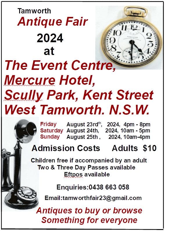 The Tamworth Antique Fair 2024 is an exciting event scheduled to take place at the Event Centre, Mercure Hotel in West Tamworth. This annual fair, known for its vast collection of antiques and collectibles, will be held from Friday, August 23rd, through Sunday, August 25th. Attendees can explore the fair on Friday from 4 PM to 8 PM, Saturday from 10 AM to 5 PM, and Sunday from 10 AM to 4 PM. With an admission cost of $10 for adults and free entry for children accompanied by an adult, the fair provides an affordable and enjoyable outing for families and antique enthusiasts alike.