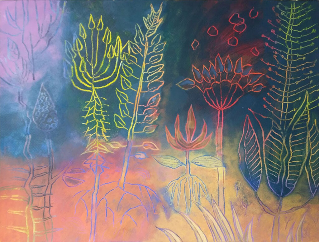 Kerry has been inspired by gardens and wild landscapes. The artworks form mosaic-like compositions with cool-climate and coastal influences drawn from life in New England.