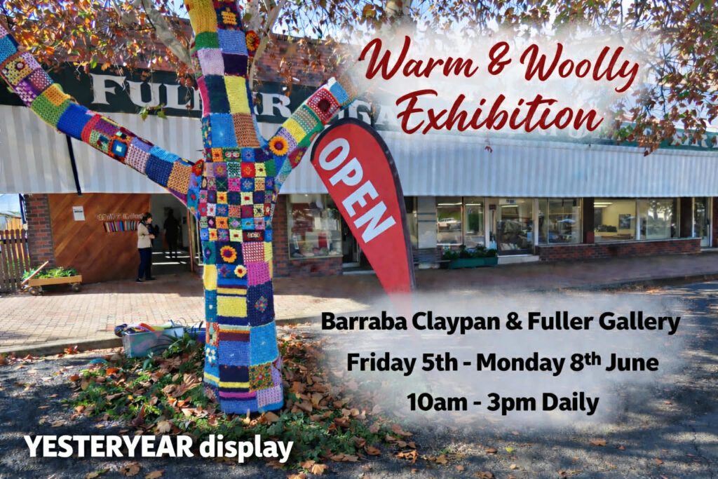 Barraba Fuller Gallery and Clay Pan Warm and Woolly Exhibition & Tree Bombing Display is on again over the JUNE Long Weekend. Tree Bombing is set to happen on Friday the 5th of June with the exhibition also opening that day and will remain open until the 8th of June 2026. A special feature of “Yesteryear” Items will be on display in the Clay Pan.
